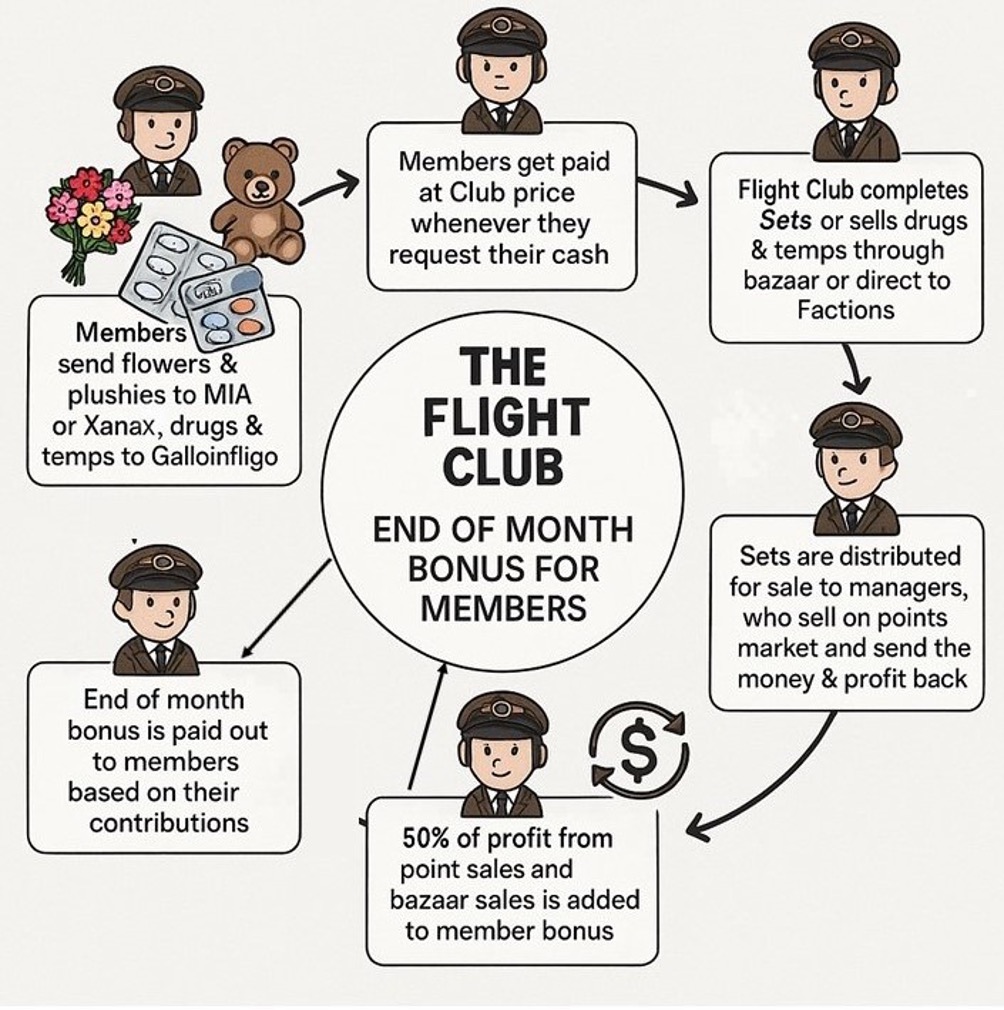 Last season we exchanged over 1.1 million sets at the Museum, and sold the points gained for profit to be shared among our members. We also traded over 300,000 Xanax that were submitted by members. To make these successes happen, the Club provides tools and resources that ensure safe and fair prices are paid for items submitted. We also have contracts in place with factions in order to regularly supply them Xanax and temps.