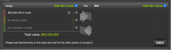 Cancel the trade later when you are ready to keep your money safe. Trades stay active for up to 6 hours, so you have plenty of time to prepare to deposit your money somewhere safe. This is how we managers keep Flight Club money safe when we sell points or items.